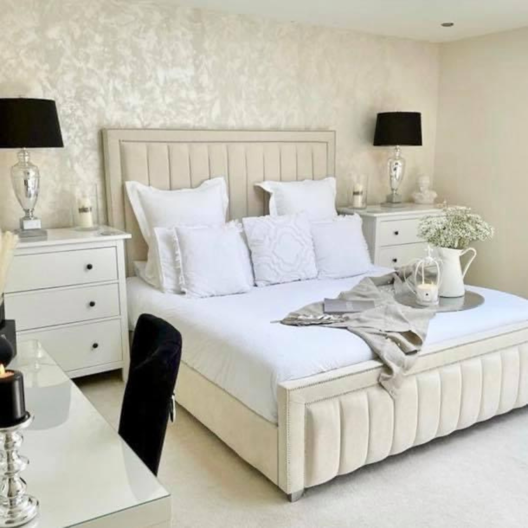 Introducing Our Brand New Luxury Dior Upholstered Velvet Bed frame With Panel Headboard. Dior Upholstered Bed Frame: A Luxurious Addition to Your Bedroom. We, at RN Interiors LTD, love creating furniture that is a mix of style, comfort, and luxury. That’s why we’re so excited to announce our newest release, the Dior Upholstered Bed Frame: a beautiful new piece of furniture that is sure to be the highlight of your bedroom! This bed frame offers a stylish solution for those looking for an easy assembly and quality materials for the perfect night's sleep.
