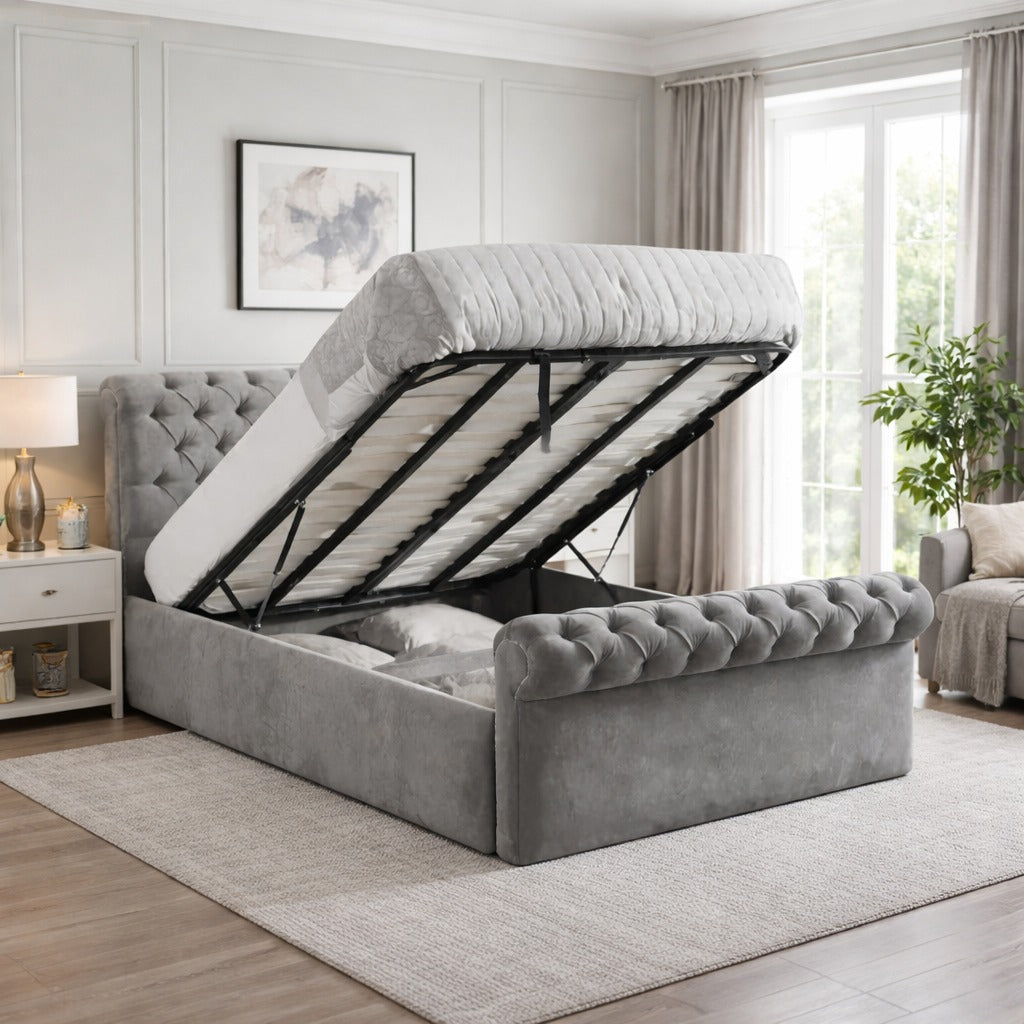 RN Interiors Luxurious Plush Velvet Ottoman Bed with Storage & Chesterfield Headboard